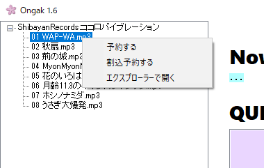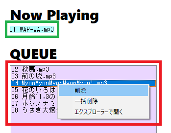 選曲中(再生中)の楽曲と予約曲一覧が表示されます。予約曲は右クリックで「選択した予約曲の削除」「予約曲の全削除」ができます。また、予約曲一覧の曲はドラッグ操作で順序変更も可能です。